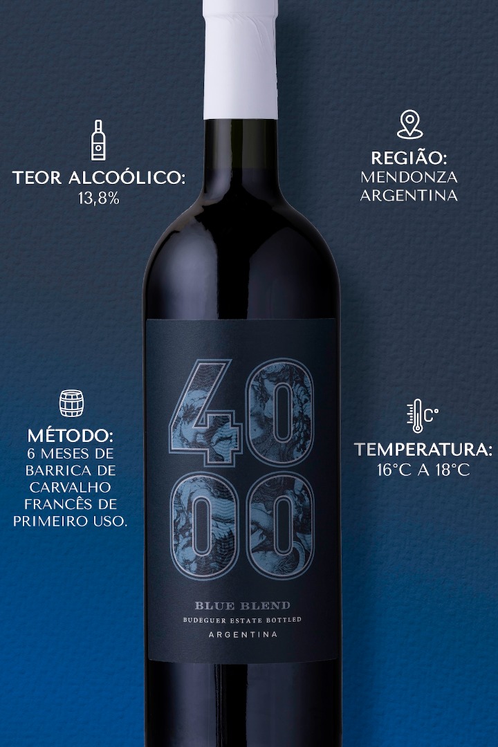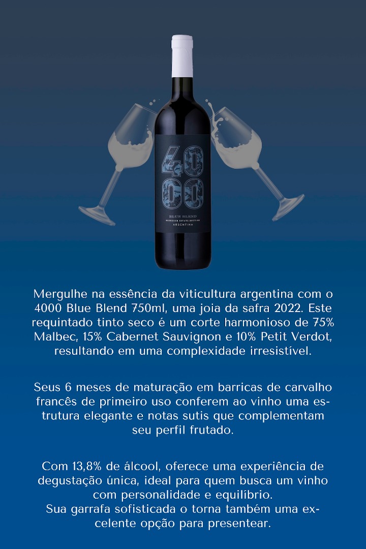 Mergulhe na essência da viticultura argentina com o 4000 Blue Blend 750ml, uma joia da safra 2022. Este requintado tinto seco é um corte harmonioso de 75% Malbec, 15% Cabernet Sauvignon e 10% Petit Verdot, resultando em uma complexidade irresistível.