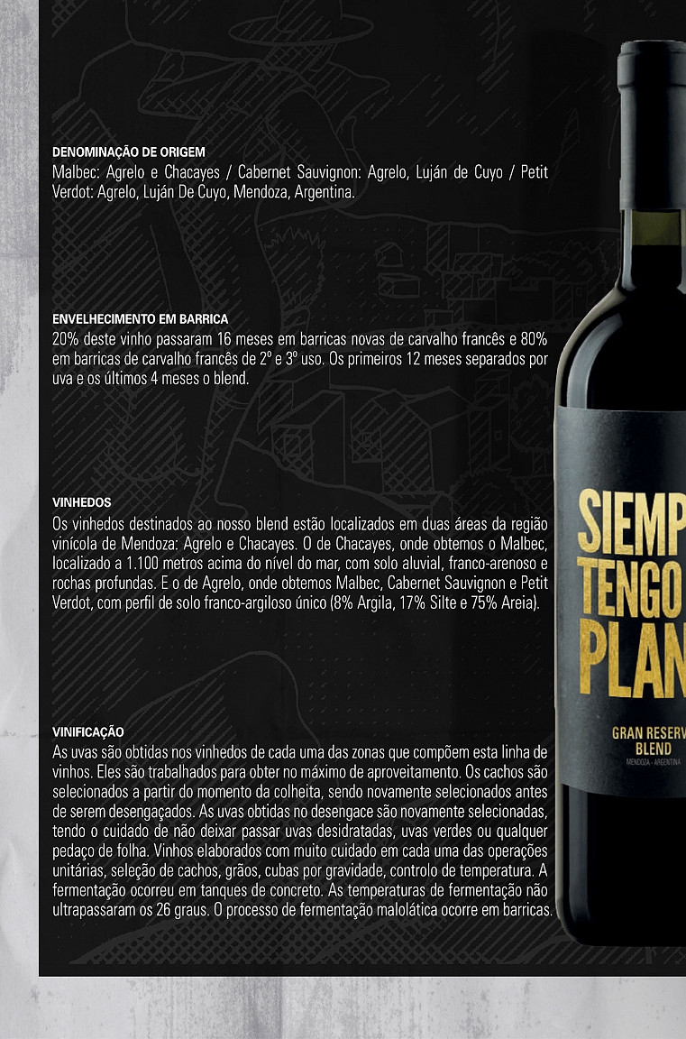 Com 14% de álcool, este vinho é uma combinação sofisticada de 75% Malbec, 15% Cabernet Sauvignon e 10% Petit Verdot.